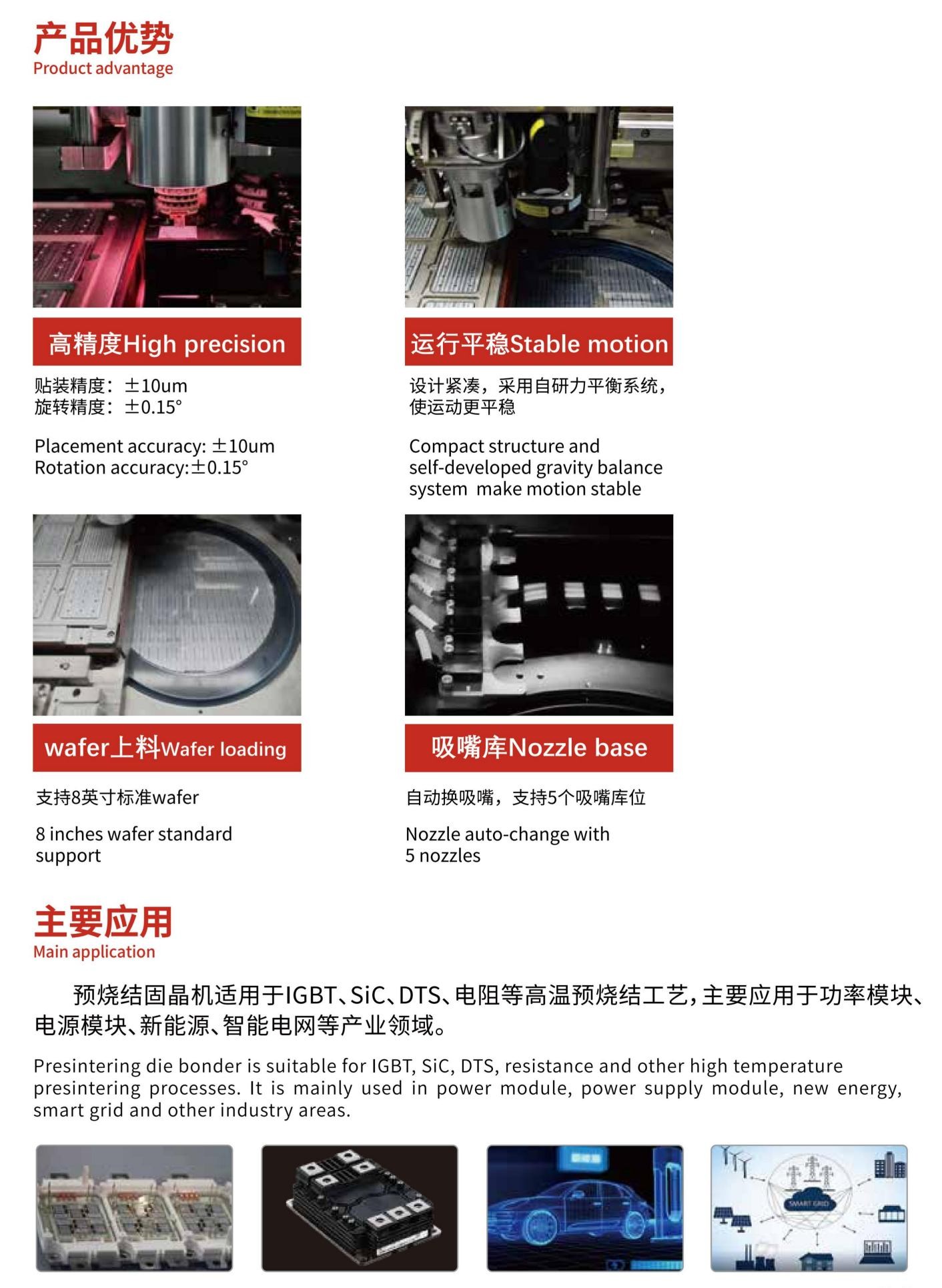 預燒結貼合機面向功率半導體芯片貼裝市場,配備功能更加強大的BONDHEAD系統,除了高精度貼合功能外,還具備保壓、加熱功能。配合高精度的加熱系統,實現電子元器件的預燒結貼合。